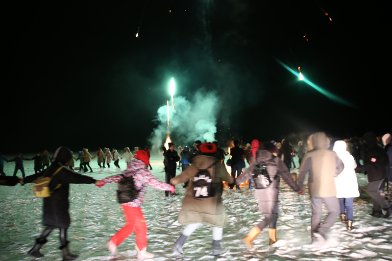 8点整,明亮的篝火、艳丽的烟花,将这个宁静的小村渲染的格外亮丽,孩子和家长们在欣赏烟花的同时,沿着篝火高兴的跳起舞来,手拉着手、心连着心,快乐的节奏让冬令营队伍里所有的人忘记了寒冷。